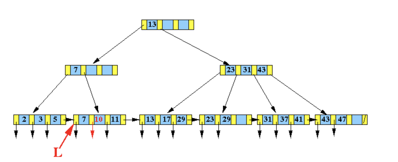 // Deletion operation on a B+ tree in C++#include<climits>#include<fstream>#include<iostream>#include<sstream>usingnamespacestd;intMAX=3;classBPTree;classNode{boolIS_LEAF;int*key,size;Node**ptr;friendclassBPTree;public:Node();};classBPTree{Node*root;voidinsertInternal(int,Node*,Node*);voidremoveInternal(int,Node*,Node*);Node*findParent(Node*,Node*);public:BPTree();voidsearch(int);voidinsert(int);voidremove(int);voiddisplay(Node*);Node*getRoot();};Node::Node(){key=newint[MAX];ptr=newNode*[MAX+1];}BPTree::BPTree(){root=NULL;}voidBPTree::insert(intx){if(root==NULL){root=newNode;root->key[0]=x;root->IS_LEAF=true;root->size=1;}else{Node*cursor=root;Node*parent;while(!cursor->IS_LEAF){parent=cursor;for(inti=0;i<cursor->size;i++){if(x<cursor->key[i]){cursor=cursor->ptr[i];break;}if(i==cursor->size-1){cursor=cursor->ptr[i+1];break;}}}if(cursor->size<MAX){inti=0;while(x>cursor->key[i]&&i<cursor->size)i++;for(intj=cursor->size;j>i;j--){cursor->key[j]=cursor->key[j-1];}cursor->key[i]=x;cursor->size++;cursor->ptr[cursor->size]=cursor->ptr[cursor->size-1];cursor->ptr[cursor->size-1]=NULL;}else{Node*newLeaf=newNode;intvirtualNode[MAX+1];for(inti=0;i<MAX;i++){virtualNode[i]=cursor->key[i];}inti=0,j;while(x>virtualNode[i]&&i<MAX)i++;for(intj=MAX+1;j>i;j--){virtualNode[j]=virtualNode[j-1];}virtualNode[i]=x;newLeaf->IS_LEAF=true;cursor->size=(MAX+1)/2;newLeaf->size=MAX+1-(MAX+1)/2;cursor->ptr[cursor->size]=newLeaf;newLeaf->ptr[newLeaf->size]=cursor->ptr[MAX];cursor->ptr[MAX]=NULL;for(i=0;i<cursor->size;i++){cursor->key[i]=virtualNode[i];}for(i=0,j=cursor->size;i<newLeaf->size;i++,j++){newLeaf->key[i]=virtualNode[j];}if(cursor==root){Node*newRoot=newNode;newRoot->key[0]=newLeaf->key[0];newRoot->ptr[0]=cursor;newRoot->ptr[1]=newLeaf;newRoot->IS_LEAF=false;newRoot->size=1;root=newRoot;}else{insertInternal(newLeaf->key[0],parent,newLeaf);}}}}voidBPTree::insertInternal(intx,Node*cursor,Node*child){if(cursor->size<MAX){inti=0;while(x>cursor->key[i]&&i<cursor->size)i++;for(intj=cursor->size;j>i;j--){cursor->key[j]=cursor->key[j-1];}for(intj=cursor->size+1;j>i+1;j--){cursor->ptr[j]=cursor->ptr[j-1];}cursor->key[i]=x;cursor->size++;cursor->ptr[i+1]=child;}else{Node*newInternal=newNode;intvirtualKey[MAX+1];Node*virtualPtr[MAX+2];for(inti=0;i<MAX;i++){virtualKey[i]=cursor->key[i];}for(inti=0;i<MAX+1;i++){virtualPtr[i]=cursor->ptr[i];}inti=0,j;while(x>virtualKey[i]&&i<MAX)i++;for(intj=MAX+1;j>i;j--){virtualKey[j]=virtualKey[j-1];}virtualKey[i]=x;for(intj=MAX+2;j>i+1;j--){virtualPtr[j]=virtualPtr[j-1];}virtualPtr[i+1]=child;newInternal->IS_LEAF=false;cursor->size=(MAX+1)/2;newInternal->size=MAX-(MAX+1)/2;for(i=0,j=cursor->size+1;i<newInternal->size;i++,j++){newInternal->key[i]=virtualKey[j];}for(i=0,j=cursor->size+1;i<newInternal->size+1;i++,j++){newInternal->ptr[i]=virtualPtr[j];}if(cursor==root){Node*newRoot=newNode;newRoot->key[0]=cursor->key[cursor->size];newRoot->ptr[0]=cursor;newRoot->ptr[1]=newInternal;newRoot->IS_LEAF=false;newRoot->size=1;root=newRoot;}else{insertInternal(cursor->key[cursor->size],findParent(root,cursor),newInternal);}}}Node*BPTree::findParent(Node*cursor,Node*child){Node*parent;if(cursor->IS_LEAF||(cursor->ptr[0])->IS_LEAF){returnNULL;}for(inti=0;i<cursor->size+1;i++){if(cursor->ptr[i]==child){parent=cursor;returnparent;}else{parent=findParent(cursor->ptr[i],child);if(parent!=NULL)returnparent;}}returnparent;}voidBPTree::remove(intx){if(root==NULL){cout<<"Tree empty\n";}else{Node*cursor=root;Node*parent;intleftSibling,rightSibling;while(!cursor->IS_LEAF){for(inti=0;i<cursor->size;i++){parent=cursor;leftSibling=i-1;rightSibling=i+1;if(x<cursor->key[i]){cursor=cursor->ptr[i];break;}if(i==cursor->size-1){leftSibling=i;rightSibling=i+2;cursor=cursor->ptr[i+1];break;}}}boolfound=false;intpos;for(pos=0;pos<cursor->size;pos++){if(cursor->key[pos]==x){found=true;break;}}if(!found){cout<<"Not found\n";return;}for(inti=pos;i<cursor->size;i++){cursor->key[i]=cursor->key[i+1];}cursor->size--;if(cursor==root){for(inti=0;i<MAX+1;i++){cursor->ptr[i]=NULL;}if(cursor->size==0){cout<<"Tree died\n";delete[]cursor->key;delete[]cursor->ptr;deletecursor;root=NULL;}return;}cursor->ptr[cursor->size]=cursor->ptr[cursor->size+1];cursor->ptr[cursor->size+1]=NULL;if(cursor->size>=(MAX+1)/2){return;}if(leftSibling>=0){Node*leftNode=parent->ptr[leftSibling];if(leftNode->size>=(MAX+1)/2+1){for(inti=cursor->size;i>0;i--){cursor->key[i]=cursor->key[i-1];}cursor->size++;cursor->ptr[cursor->size]=cursor->ptr[cursor->size-1];cursor->ptr[cursor->size-1]=NULL;cursor->key[0]=leftNode->key[leftNode->size-1];leftNode->size--;leftNode->ptr[leftNode->size]=cursor;leftNode->ptr[leftNode->size+1]=NULL;parent->key[leftSibling]=cursor->key[0];return;}}if(rightSibling<=parent->size){Node*rightNode=parent->ptr[rightSibling];if(rightNode->size>=(MAX+1)/2+1){cursor->size++;cursor->ptr[cursor->size]=cursor->ptr[cursor->size-1];cursor->ptr[cursor->size-1]=NULL;cursor->key[cursor->size-1]=rightNode->key[0];rightNode->size--;rightNode->ptr[rightNode->size]=rightNode->ptr[rightNode->size+1];rightNode->ptr[rightNode->size+1]=NULL;for(inti=0;i<rightNode->size;i++){rightNode->key[i]=rightNode->key[i+1];}parent->key[rightSibling-1]=rightNode->key[0];return;}}if(leftSibling>=0){Node*leftNode=parent->ptr[leftSibling];for(inti=leftNode->size,j=0;j<cursor->size;i++,j++){leftNode->key[i]=cursor->key[j];}leftNode->ptr[leftNode->size]=NULL;leftNode->size+=cursor->size;leftNode->ptr[leftNode->size]=cursor->ptr[cursor->size];removeInternal(parent->key[leftSibling],parent,cursor);delete[]cursor->key;delete[]cursor->ptr;deletecursor;}elseif(rightSibling<=parent->size){Node*rightNode=parent->ptr[rightSibling];for(inti=cursor->size,j=0;j<rightNode->size;i++,j++){cursor->key[i]=rightNode->key[j];}cursor->ptr[cursor->size]=NULL;cursor->size+=rightNode->size;cursor->ptr[cursor->size]=rightNode->ptr[rightNode->size];cout<<"Merging two leaf nodes\n";removeInternal(parent->key[rightSibling-1],parent,rightNode);delete[]rightNode->key;delete[]rightNode->ptr;deleterightNo