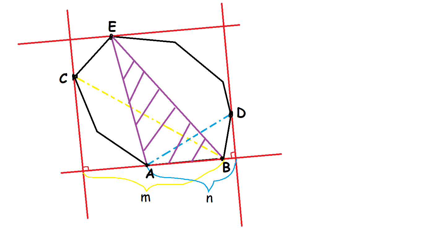有了上一道题做铺垫,这道题比较直观的想法仍然是使用旋转卡壳法,不过这次要求的是面积,像上一题一样只维护一个最优点就只能找到一对距离最小的平行线,我们还需要确定矩形的左右边界。所以这次我们需要维护三个点:一个在所枚举的直线对面的点、两个在不同侧面的点。对面的最优点仍然是用叉积算面积来比较,此时比较面积就是在比较这个矩形的一个边长。侧面的最优点则是用点积来比较,因为比较点积就是比较投影的长度,左右两个投影长度相加可以代表这个矩形的另一个边长。这两个边长的最优性相互独立,因此找到三个最优点的位置就能够确定以当前边所在直线为矩阵的一条边时,能覆盖所有点的矩形最小面积。