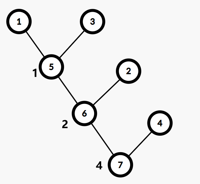 不难发现,在进行 轮之后我们得到了一棵恰有 个叶子的二叉树,同时每个非叶子节点恰好有两个儿子。这棵树就叫 Kruskal 重构树。