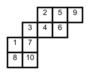 同理,若满足同一列中的数字严格递增,且同一行中的数字单调递增,则该斜杨表被称作 半标准斜杨表;若半标准斜杨表满足各方格不重复的填入数字