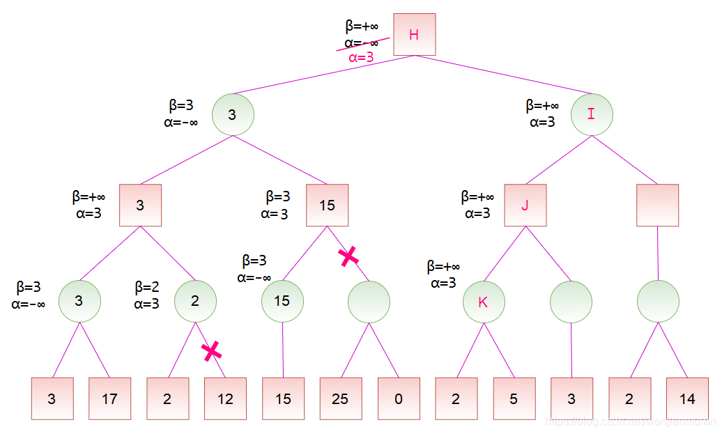 计算出节点 K 的分数后,节点 K 是节点 J 的一个子节点,故可以更新节点 J 的分数范围。节点 J 是 MAX 节点,更新