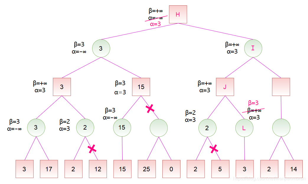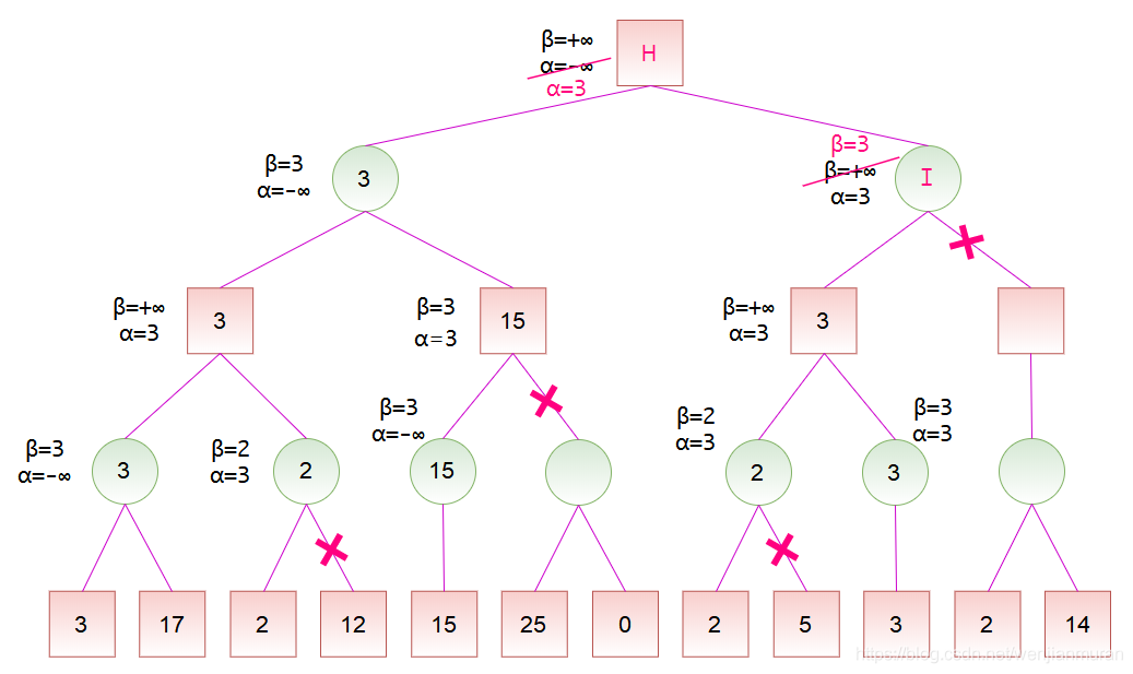 计算出节点 D 的分数后,节点 D 是节点 H 的一个子节点,故可以更新节点 H 的分数范围。节点 H 是 MAX 节点,更新