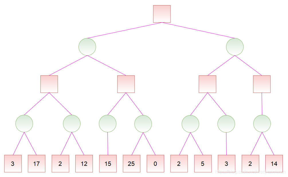 在局面确定的双人对弈里,常进行对抗搜索,构建一棵每个节点都为一个确定状态的搜索树。奇数层为己方先手,偶数层为对方先手。搜索树上每个叶子节点都会被赋予一个估值,估值越大代表我方赢面越大。我方追求更大的赢面,而对方会设法降低我方的赢面,体现在搜索树上就是,奇数层节点(我方节点)总是会选择赢面最大的子节点状态,而偶数层(对方节点)总是会选择我方赢面最小的的子节点状态。