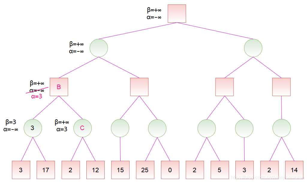 节点 A 是节点 B 的子节点,计算出节点 A 的分数后,可以更新节点 B 的分数范围。由于节点 B 是 MAX 节点,试图找分数大的走法,于是将