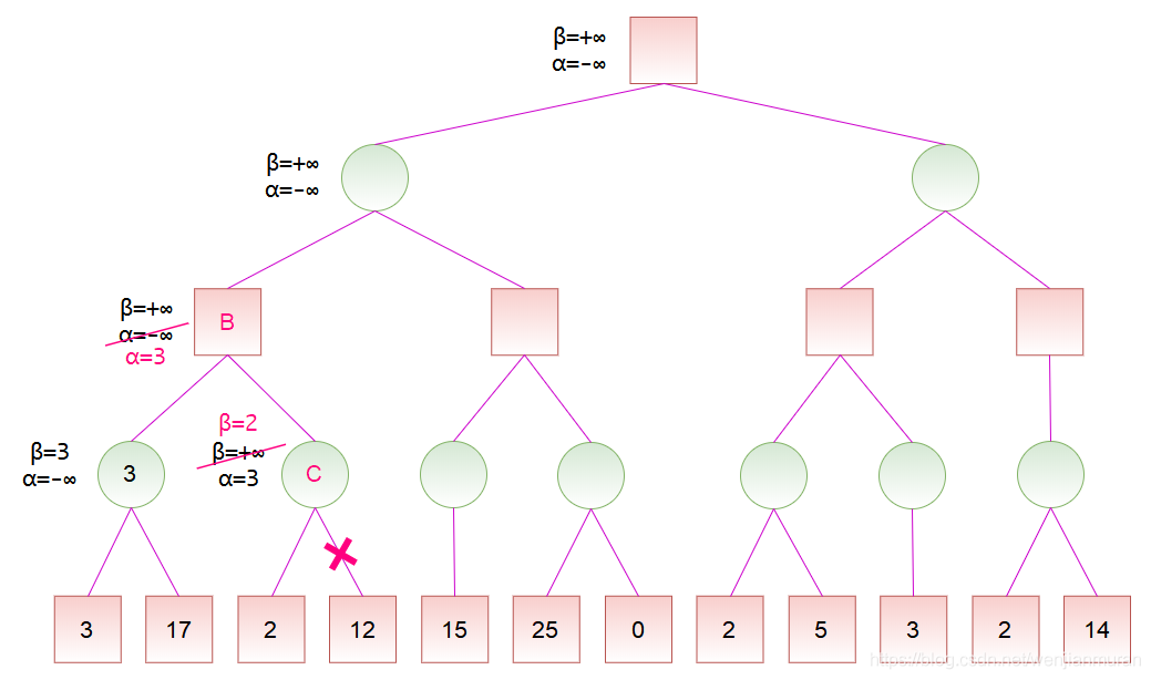对于节点 C,由于左子节点的分数为 2,而节点 C 是 MIN 节点,于是将