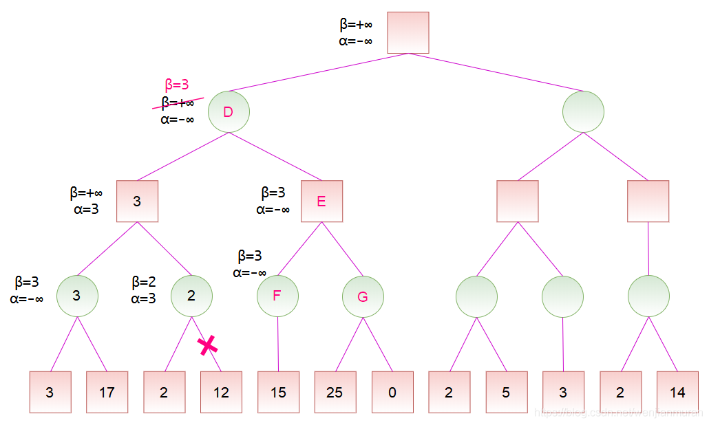 计算出节点 B 的分数后,节点 B 是节点 D 的一个子节点,故可以更新节点 D 的分数范围。由于节点 D 是 MIN 节点,于是将
